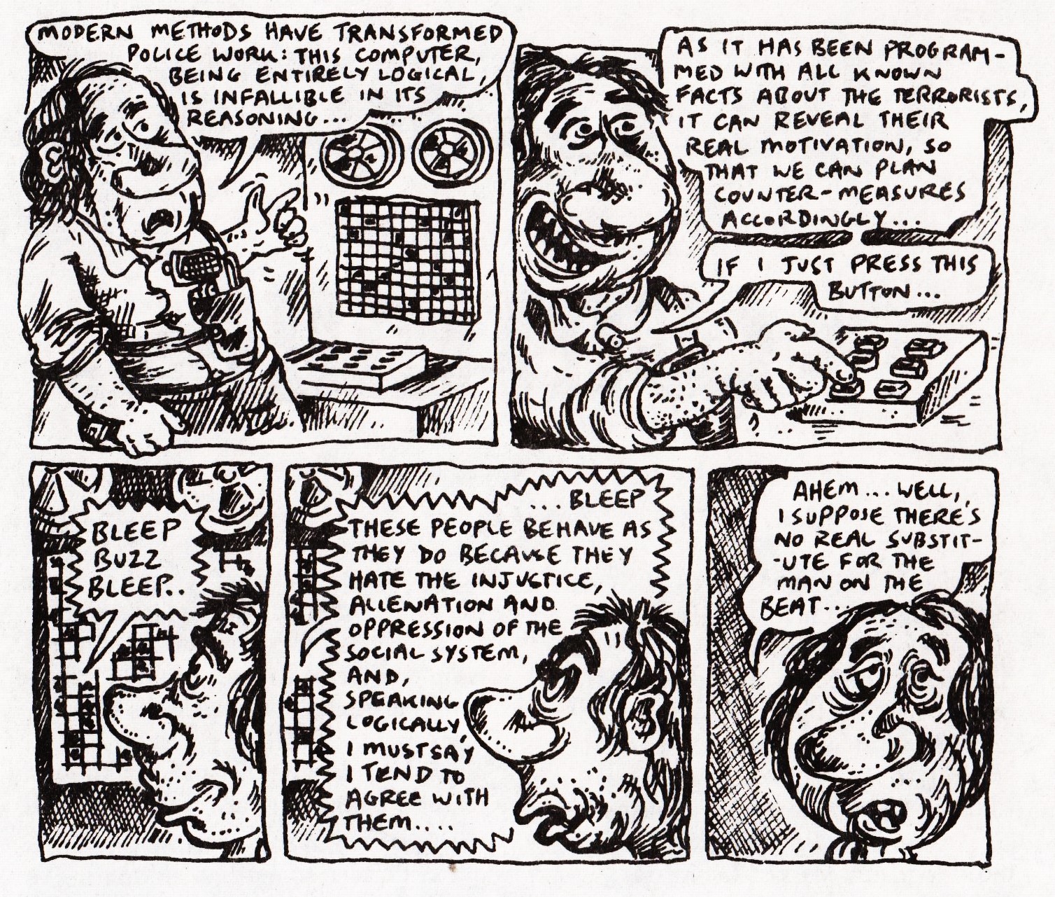 [Policeman reaches to press button]: ‘As it has been progammed with all known facts about the terrorists, it can reveal their real motivation, so that we can plan counter-measures accordindly… If I just press this button…’