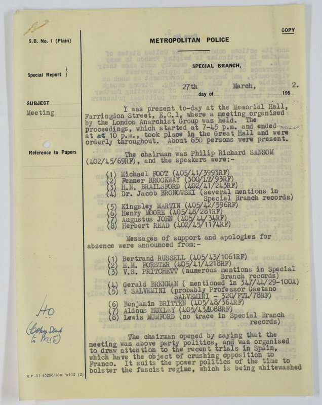 In Special Branch report on protest meeting against Barcelona executions (1952)