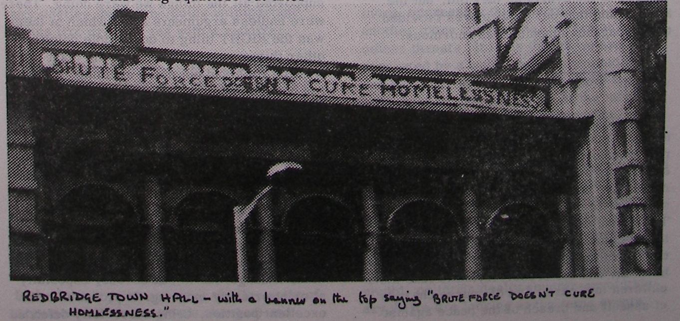 [Photo, caption: Redbridge Town Hall with a banner on the top saying “Brute force doesn’t cure homelessness.”]