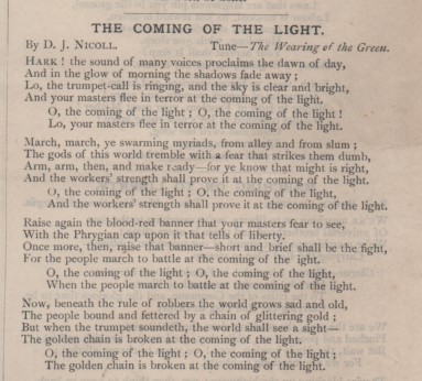 From a socialist song sheet from 1895, published by the Leicester Anarchist-Communists. You can see the songsheet at https://www.andrewwhitehead.net/political-ephemera.html (Thanks to AW for supplying the image of ‘Coming of the light’)