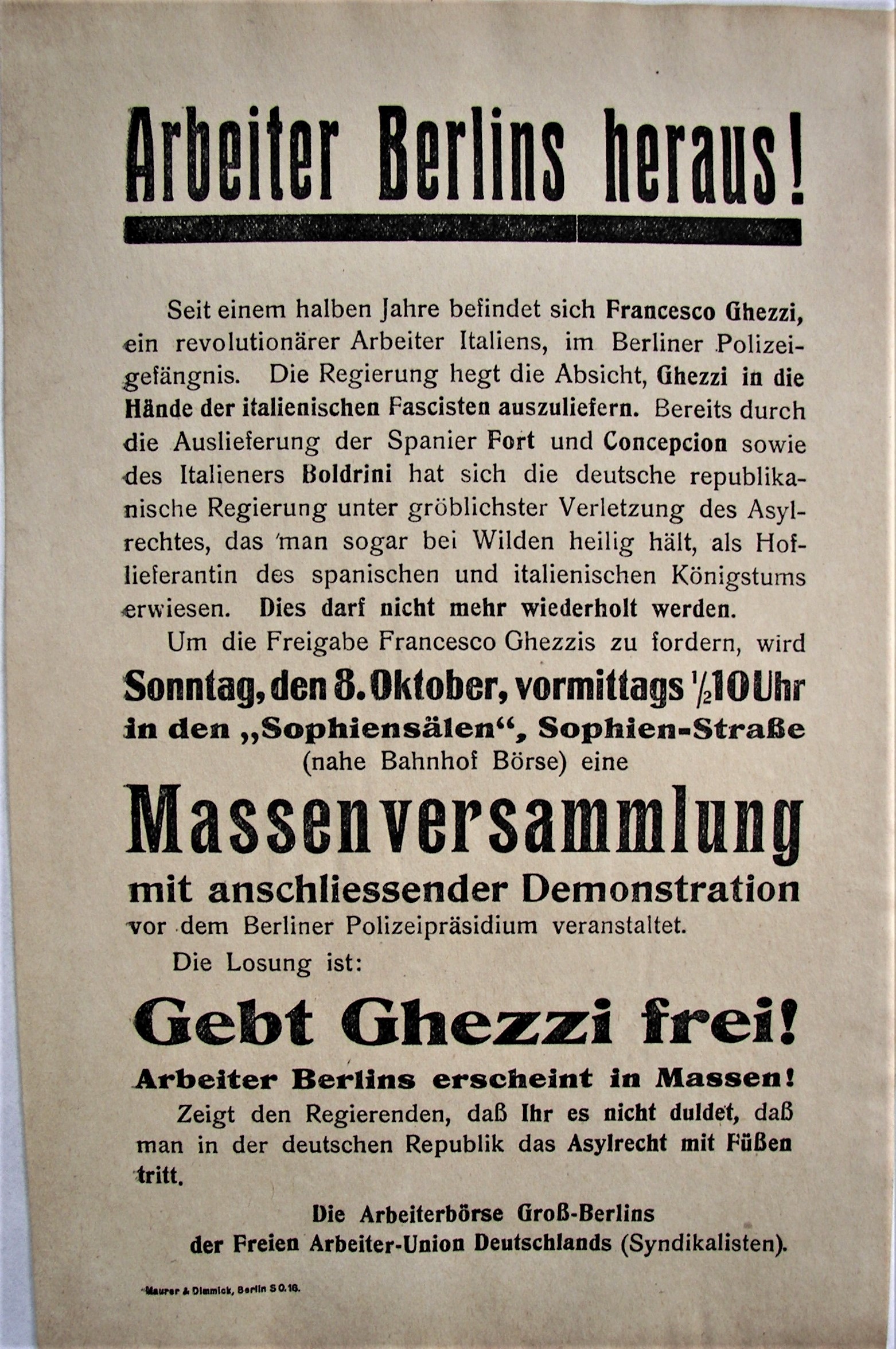 Arbeiter Berlins heraus! Gebt Ghezzi frei! [FAUD protest leaflet in solidarity with Francesco Ghezzi, October 1922]